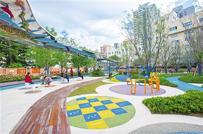 开放式公园绿地,打造休闲娱乐好去处。将新生的乐山绿地融合中国园林的山水观,打造成一个开放式公园绿地,内设儿童活动场地、健身场地、休闲平台、智能健身环道等,不仅是老年人的好去处,更是平日里的遛娃必备。