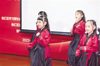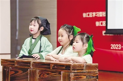 “云对雨,雪对风,晚照对晴空。来鸿对去雁,宿鸟对鸣虫……”徐汇区一中心小学的孩子们以这首《声律启蒙》打头阵,第一次登台比赛,一年级的小魏和小毛又紧张又兴奋,他们告诉记者,声音小了点,有些害羞,但前后学了一个月,就算紧张也还是没出错,挺满意的。带队老师陈老师介绍,对韵文字优美,富节奏感,特别适合低年级孩子,吟诵起来有韵律之美,也朗朗上口。
