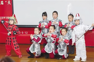 “三年前我第一次来到这里,玩具扔满地,还要发脾气;今天站在这里的还是我自己,脸上再也没有泥,手帕、袜子,自己洗,还会唱歌、跳舞、画画、讲故事,懂得了很多道理……”毕业诗之后,小朋友还吟诵了五言绝句《登鹳雀楼》,以“欲穷千里目,更上一层楼”表达对未来自己的期许。班主任王老师告诉记者,这样的混搭来自孩子们的创意,“不少孩子会一些简单的唐诗,问他们毕业后要怎么样啊,他们回答,要‘更上一层楼’。”