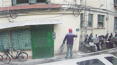 接报后,民警立即展开调查。经调阅公共视频发现,有一名身穿工作服的男子将梯子架在楼栋下,爬上去后就开始熟练地切割网线,再将线扯下来卷了一大卷后扬长而去,看上去不慌不忙,就像工人在修理线路。警方随即锁定目标,并将违法人员朱某抓获,整个侦破过程不到3个小时。
