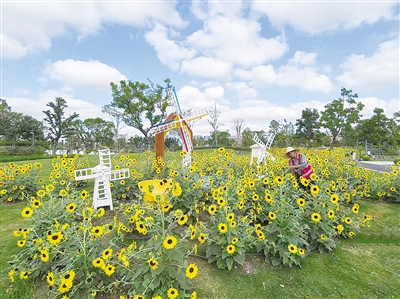 蓝天白云,秋高气爽。近日,上海植物园北区一丛丛、一簇簇小向日葵迎着阳光,摇曳生姿,呈现一派生机勃勃、欣欣向荣景象,同时也成为游客打卡地之一。 图为园林绿化工人正在绿化养护 殷志军 摄影报道