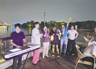 演出中途,互动环节更是将气氛推向高潮。当乐队邀请观众上台合唱《稻香》时,几位年轻游客主动举手,接过话筒与乐队默契配合(如图)。“没想到大家这么热情!”乐队主唱笑着说,“看到大家跟着音乐互动,我们也感觉特别有感染力,这就是中秋团圆的意义吧。”游轮外,月光洒在江面上,波光粼粼,与船舱内的歌声、笑声融为一体,构成一幅温馨的“月下浦江夜曲图”。