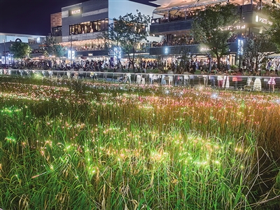 此外,今年策划团队还新增了植物的气膜。气膜里藏着“梦幻森林”,不同形态的自然奇境随光影流转;繁星洒落草坪,闪光灯球旋转出细碎光芒,耳畔舒缓的白噪音盖过城市喧嚣,仿佛置身静谧的夜间“光影花园”。在这里,工业的硬朗与自然的柔软碰撞,恰如徐汇滨江“生态优先、科创主导”的发展理念,让每一位访客都能在繁华闹市中找到治愈角落。李炎给这套装置也打了高分,“这些会发光的装置尤其深受亲子家庭的喜爱。”