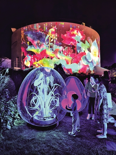 李炎告诉记者,“今年的光影节联动了海内外的艺术家,创作手法相较去年更突出了国际性。比如我们和具有国际背景的巴西团队合作,光影内容有热带雨林文化、有当地的图腾,又比如我们观察到国内外的观众都更喜欢装置的互动性。去年光影节的时候观众只能在临街面观赏油罐的投影秀,今年油罐的后侧是可以走进去的,我们在那里安装了可以反射的闪光灯球,观众可以拥有与光影共舞的体验。去年没有修缮好的砼仓,今年也得到了焕新升级,观众可以乘坐电梯到砼仓上方,和投影面产生交互,在砼仓下方空间还设置了沉浸式体验激光装置,当观众的手触碰到激光的时候,会产生奇妙的感觉。”
