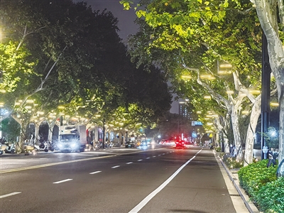 徐汇区“亮灯工程”成效显著。华灯初上,在绿荫婆娑下悬挂、镶嵌的各式“灯具”造型别致,光韵柔美。图为10月12日晚九时许的零陵路灯光夜景 殷志军 摄影报道