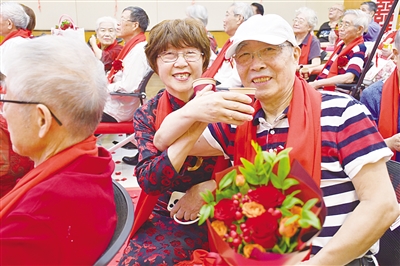 在《祝酒歌》的烘托下,老人们共饮象征同甘共苦的“交杯酒”,将风雨同舟的情谊融入杯中(如图)。田林街道田林十四村第二居民区党总支书记苏嵘告诉记者,很多老人说,当年没条件办婚礼,现在就算自己办,也不如社区办得好,自己办可能只是形式,但我们这场活动,已经超出了形式,是爱与爱的传递。”