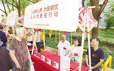 除了企业的大力支持,区人大代表也深度参与到敬老月活动中。国网上海市电力公司一级职员主任李钧、商汤集团首席运行官兼副总裁骆静、中国电子科技集团公司第二十一研究所副所长郑文鹏等3位徐汇区人大代表,不仅现场认领助老公益项目,还在公益集市上坐镇“人大代表在行动”摊位,与老年居民面对面交流,倾听居民心声、耐心解答疑问;同时,他们也带来了所属单位的公益项目,让履职服务更加贴近民心、接地气。