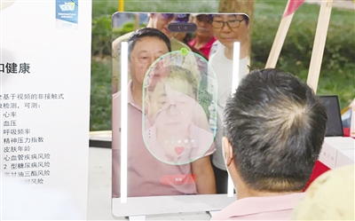 在智慧医养体验区,“智能健康魔镜”前排起了长队,人气十足。居民们只需出现在镜子前,进行30秒的AI扫脸,就能通过非接触式检测,快速获取心率、血压、心血管疾病风险、2型糖尿病风险等30多项健康指标。旁边还有能通过扫手指识别血管健康状态的设备,让老人们在家门口就能享受便捷的健康检测服务,实现科技为养老赋能。