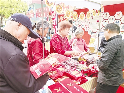 在“中华老字号”板块,始于1909年的“乔家栅”是上海人熟悉的老品牌,摊位上的重阳糕十分应景。来自天津的“迎宾老大房”,和上海老大房是“同门”,他们带来了爆肉脆烤肠、虎皮凤爪等鲜卤熟食。在“绍兴好物”摊位上,“松盛园”甜面酱、黄豆酱、古法秋油等产品,都是老百姓餐桌上熟悉的味道,咸亨茴香豆、咸亨椒盐香糕更是回味悠长。