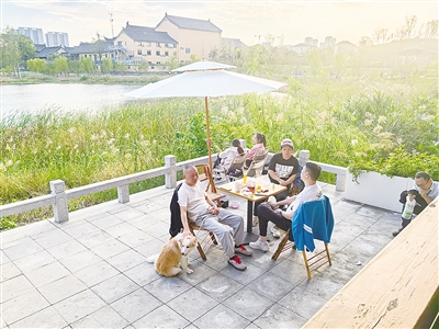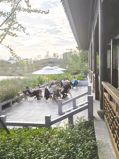 浸想宅院自今年10月1日开业以来,来体验的游客络绎不绝。浸想宅院有适合商务洽谈的区域,藏在公园的最深处。“我们希望为上班族提供一个更优雅的交流平台和环境。”胡先生说道。这里临水而建的外摆区,对宠物也非常友好。
