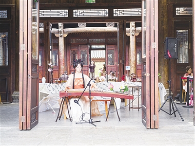 拾级而上,就来到浸想宅院最宽敞的一个庭院。在这里,或一家出游,或好友相聚,古朴的竹制桌椅遇上文化表演,悠扬的琴声缓缓传来……几乎每桌都有一个竹编的热水瓶,加上茶具、坚果类零嘴,游客们尽享惬意。