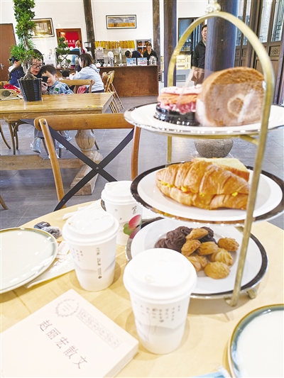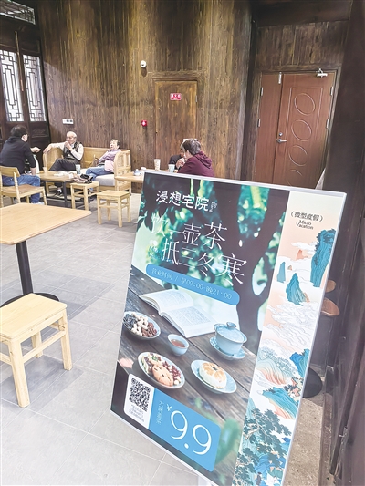 浸想宅院的运营方代表胡先生告诉记者:“我们推出的亲民套餐——9.9元的大碗盖茶套餐,一碗茶加一只竹壳子热水瓶,可以让游客在公园休闲中歇歇脚、听听曲,也是另一种放松。”除了这个亲民套餐,浸想宅院还提供29.9元的轻享套餐(三明治任选+柠檬红茶),爱好西式餐饮的游客也可以选择咖啡和其它甜点。