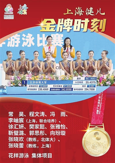在刚刚结束的第十五届全运会花样游泳集体项目决赛中,来自上海并与北京体育大学联合培养的运动员李岫宸,与队友常昊、程文涛、冯雨、徐汇妍、樊家懿、张雅怡、靳璧潞、郭思彤、向玢璇协同作战,勇夺冠军。