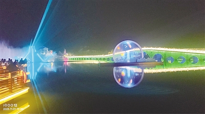 走过沈厅、渔坊,万三财道码头,到了南湖湾的栈道上,看着湖中的夜景,水天一色,美不胜收,变幻莫测,真正的“赤橙黄绿青蓝紫、谁持彩练当空舞”。对面的全福长桥如同长虹一般横卧湖面之上。我们赶上了从18:30起每半个钟头表演的5分钟蚬江桥的“蚬江渔唱”光影秀。蚬江湾光影秀以水雾、水幕、激光投影、LED电脑灯等方法,描绘着蚬江湾里的渔家生活,巨大多变的彩色光球、似箭似线的五彩射线、万紫千红的几何图形,光球内跳跃着的一幅幅渔家生活和劳作的抽象画面,让我看得如痴如醉,和现场观众一起忍不住爆发出阵阵的惊叹声。站在栈道上的每个人几乎都在用智能手机拍摄这美妙的5分钟光影秀。