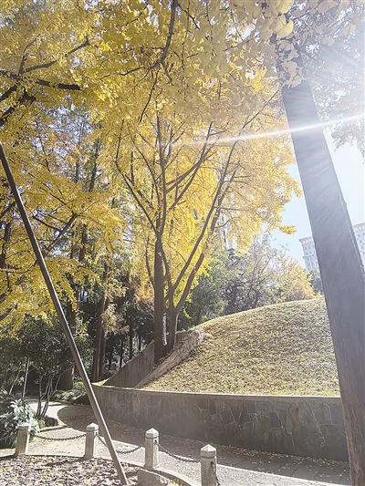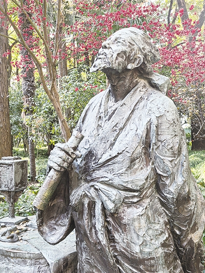 1633年12月8日,明代科学家徐光启逝世。徐光启生于松江府上海县法华汇(今徐家汇地区),官至太子太保、礼部尚书兼文渊阁大学士,一生中翻译了大量西方科学著作,推动了中西方文化的交流。图为位于光启公园,一边徐光启墓地金黄色银杏叶掉落在墓地上;另一边徐光启雕塑在红枫掩映下,令人肃然起敬 殷志军 摄于12月8日