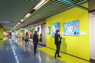 展览现场热闹而有序,不少乘客被画作中斑斓的色彩与超现实的意境吸引,有人放慢脚步静静品味线条与色彩交织的奇幻叙事,有人举起手机拍照打卡,让梦境般的艺术品成为朋友圈的独特背景。刚下班的陈女士特意与胡安·米罗的自画像合影,她笑着说:“每天都坐地铁经过这里,今天突然发现变成了艺术展,太惊喜了!米罗的画像闯进了梦境,色彩特别治愈。”带着孩子观展的张先生则表示:“接孩子放学正好路过。孩子对画里的线条和色块特别感兴趣,还问我是不是外星人画的。这种沉浸式的艺术体验,比逛美术馆更接地气。”