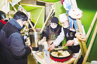 活动现场,饺子品尝与制作区是当之无愧的“人气担当”。才众餐饮、漕河泾社区食堂等7家单位的师傅们巧手翻飞,不同口味的饺子迅速成型、下锅,5个免费品尝摊位前很快排起了长队。“跑了一上午单,能吃上一碗热乎饺子,心里特别暖!”外卖骑手王师傅端着刚出锅的饺子,脸上满是笑意,“不光能吃,还能跟着学包饺,这种热闹的节日氛围,好久没感受到了。”在互动制作摊位,新就业群体与亲子家庭围在一起学包饺,欢声笑语让冬日的中庭暖意十足。