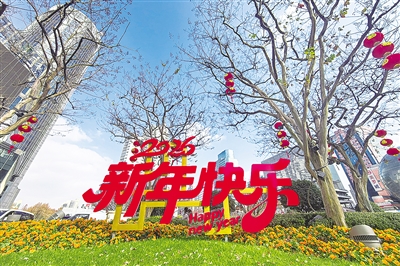 2026新年来临之际,徐汇区街头巷尾呈现出一派喜气洋洋的节日氛围。在徐家汇商圈中央绿地,翠绿草坪上摆放着醒目的红色“2026新年快乐”立体字牌,旁侧树木挂有红灯笼,金黄色花卉环绕四周。现代化高楼的硬朗线条,配合柔美的植物、热烈的新年装饰,绘就徐家汇商圈独有的新年画卷。 朱亮 摄影报道