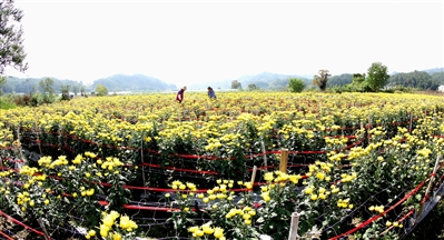 10月30日,歙县富堨镇中溪村,金丝皇菊铺满田间,菊农采菊、运菊、烘菊、售菊,一派繁忙秋收景象。据悉,今年金丝皇菊干花每公斤售价200多元,大户家庭单项收入超万元。 吴建平/摄
