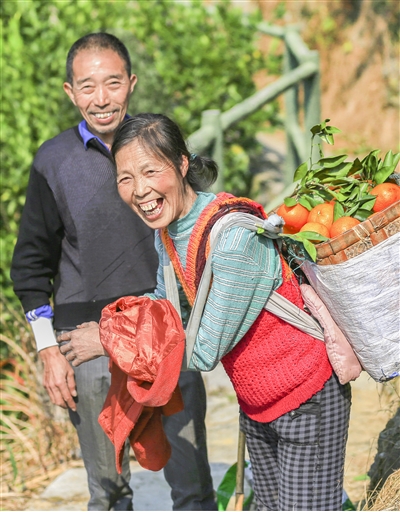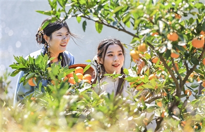 游客在新溪口乡塔坑村的桔园内,体验采摘乐趣
