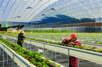 11月3日,祁门县小路口镇鸟巢型雾培蔬果基地内,务工村民正在查看种植的草莓长势,并平整有机肥。 2023年,小路口镇投资建设了7300平方米的鸟巢型雾培蔬果基地,引入智能温室、栽培设施、物联网系统等新技术,实现大棚无土栽培。蔬果基地投产后,每年不仅可增加村级集体经济收入,还能吸纳不少周边村民就业,带动乡亲致富。 程启群/摄