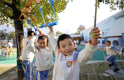 11月6日,黄山市示范幼儿园的小朋友们在新建的大型户外安吉游戏器械中畅玩晨间运动游戏,通过攀、爬、钻、跨、拉、吊、跃等增强体能。 近年来,我市大力推进学前教育普及普惠创建工作,补齐学前教育短板,完善学前教育公共服务体系,让幼儿园的孩子们享受快乐、健康成长。 樊成柱/摄