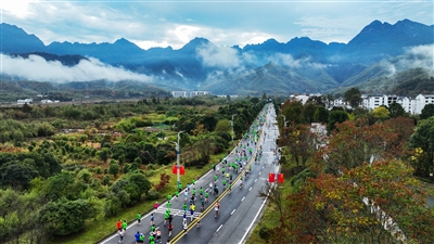 2024黄山马拉松赛道设计独具匠心,特别是打造了全国首条“跃山向湖·山水赛道”。随着发令枪一响,选手们从起点出发,向着“天下第一奇山”黄山奔跑,穿越风景如画的“仙境330”旅游风景道,最终抵达“江南翡翠”太平湖。当天下过一场小雨,沿途山色空蒙、云雾缭绕,黄山秋色与澄澈湖水交相辉映,选手们仿佛奔跑在美丽的水墨画中。