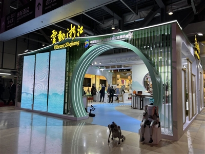 浙江人文交流展区以“灵动浙江”为主题、浙江历史经典产业为主线,分为“时光织梦”“天工开物”“味美浙江”“好戏连台”四大板块。展区内涵盖浙江的黄酒、中药、丝绸、文房、石雕、青瓷、宝剑、茶叶等历史经典产业,共63个项目,展示面积612平方米。其中含“中华老字号”项目23个、“浙江老字号”13个;国家级非遗项目20个、省级非遗项目11个。