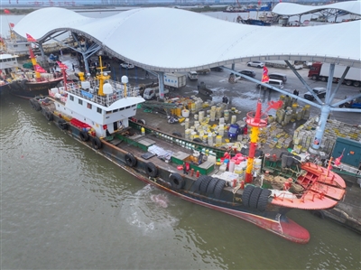 11月10日,渔民在启东吕四渔港码头卸运到港的海产品(无人机照片)。