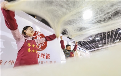 11月12日,深渡镇丝绸文化园生产车间内,工人用“黄金茧”制作彩色蚕丝被。