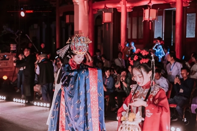 夜幕降临,华灯初上,徽州古城热闹起来,沉浸式实景演出《徽州府有喜》精彩上演。演出依托徽州府衙建筑群,将传统徽文化与现代戏剧巧妙结合,赋予新的时代内涵。观众在演出中可随时与演员零距离互动,行进式演出体验令市民和游客耳目一新,如痴如醉沉浸其中。