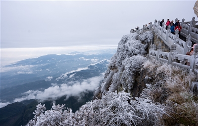 游客在峨眉山金顶远眺群峰与云海(11月20日摄)。 近日,峨眉山迎来今冬第一雪,奇峰、林海、云雾与冰雪绘就了一幅幅银装素裹的美丽画卷。 新华社记者 刘莲芬/摄