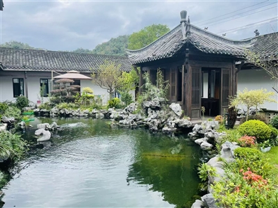 午餐后去往桃源村,车子来到一座设计别致的民宿。这里虽地处偏远山区,但环境清净雅致,我们一行都有被惊艳到的感觉。院内一爿凉亭,一弯小桥,流水潺潺绕屋,几尾悠哉红鱼,四周草木扶疏,围墙转角的红枫叶告诉人们,这是秋天。原来,此民宿为安徽省“皖美金牌民宿”——乾元涧。我们一行在此小憩片刻时,民宿主人方老板热情地招呼大家就座品茶。民宿大厅既是早餐厅,亦是茶室,室内设计略带日式侘寂风,大厅中间摆放一原木大板茶桌,两边为卡座,墙面则是大块玻璃,在此静谧之处用餐、品茶可观庭院景致,位置不同,景致不同,既可一目了然,抑或移步换景,给人以设计美学精巧之感。客房内布置得温馨宜人,推开房门,舒适感扑面而来。深山有如此高端民宿,炎炎夏日,则可通过后院的小路穿过茶园和竹林,来到河边戏水玩耍;冬日可围炉煮茶。春秋天的风景自是不必说的好。如此四季,仅需来此小住时日,即可体会山野居所的迷人所在。