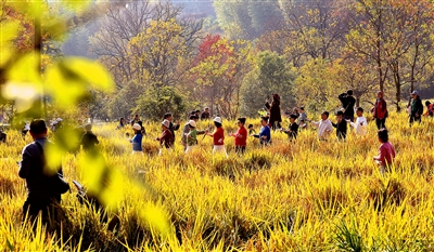 11月23日,一批游客在黟县塔川享受大自然的惬意时光。
