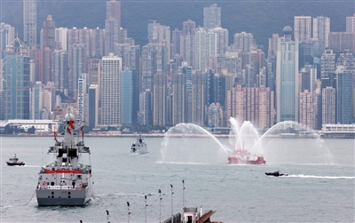 11月25日,香港特区消防船为起航返回广东湛江的海军舰艇编队行“水门礼”。 由海南舰和长沙舰组成的海军舰艇编队25日结束访问香港,起航返回广东湛江。这是海南舰、长沙舰第一次访问香港,也是海南舰第一次面向公众开放。为期3天的舰艇开放参观活动中,约1.5万人次登舰参观。 新华社发(易定/摄)
