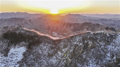 11月26日在河北省遵化市小厂乡寨主沟村附近拍摄的晨光中的长城(无人机照片)。近日,河北省部分地区迎来降雪。雪后长城银装素裹,美景如画。 新华社发(刘满仓/摄)