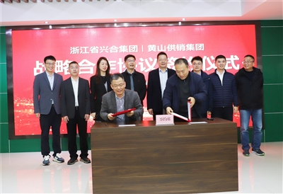 随后,浙江省兴合集团和黄山供销集团签署战略合作协议,携手推动浙黄两地农业板块等多个领域资源共享。“这次签署战略合作协议只是两地携手共赢发展的起步,今后我们要以此次战略签约为契机,充分整合系统内外资源,在项目、产品等方面互通有无,深入学习借鉴对方好经验、好方法,为两地发展注入新动力。”董益彪表示。