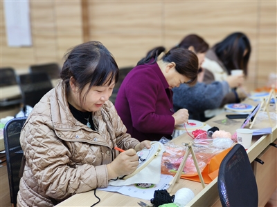 “戳戳绣”也叫戳戳乐,衍生于墩绣,是一项传统工艺,也是一项“超级解压”的手工制作活动。一片欢声笑语中,一件件绣品完美成型。活动既让大家释放了压力,也是对针尖上的传统文化的延续与传承。 魏 芳/摄