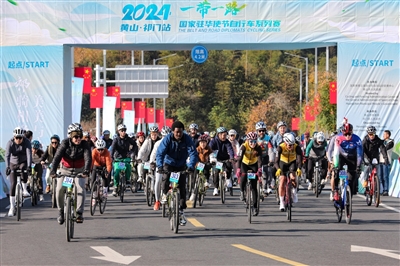 11月30日,2024“一带一路”国家驻华使节自行车系列赛(黄山·祁门站)在祁门县祁门南站开赛。多国驻华使节、留学生代表及自行车运动爱好者等400余人“骑”聚中国红茶之乡,体验骑行的乐趣。 樊成柱/摄