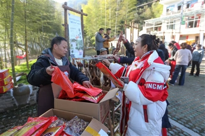 11月30日,徽州区杨村乡“榧翠山口”山货节拉开帷幕。山货市集上,香榧、茶叶、土猪肉、干笋、腊肉等特色农产品琳琅满目,现场还开展了徒手剥香榧、夹黄豆、套圈赢蔬果等互动项目,吸引大量市民游客参与。 程琦晗/摄