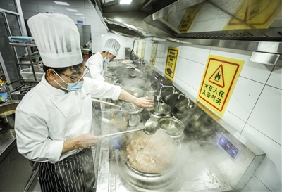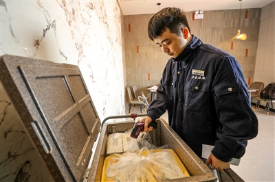 工作人员将新鲜出炉的热链食品装入保温箱 樊成柱/摄