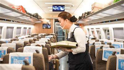 乘务员为乘客送上徽菜套餐 任俊翔/摄