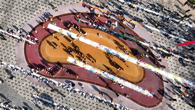 12月3日上午,由市妇女联合会、屯溪区教育局联合主办的“艺”路“童”行 共绘未来——黄山市儿童友好亲子艺术嘉年华在花山谜窟儿童友好主题园区举行,市示范幼儿园全体教职工和幼儿及家长代表共计1800余人参加。孩子们在百米长卷上以拓印、撕贴、水粉、简笔画等形式绘出自己的心声和梦想。 樊成柱/摄