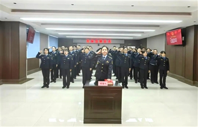 宣誓仪式现场庄重严肃。全体宣誓人员身着制服,队列整齐,仪式在雄壮的中华人民共和国国歌声中拉开序幕。随后,领誓人面向国旗国徽,手抚宪法、领诵誓词,其他宣誓人列队站立、跟诵誓词。
