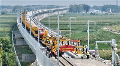 当日,在淮宿蚌城际铁路铺轨施工现场,中铁一局施工人员将首对500米长钢轨铺设在无砟轨道上,这标志着淮宿蚌城际铁路全线开始铺轨。