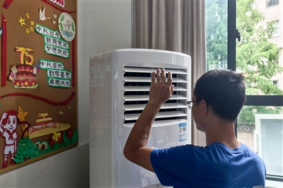 8月11日,在屯溪现代实验学校,安装工人正在加紧调试空调设备。今年暑期,市本级和屯溪区投入资金近1800万元,用于中心城区20所中小学的电力扩容、线路改造和空调安装。目前,各所学校安装工作正有序推进中,预计8月底前全面完成。