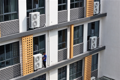 8月11日,在屯溪现代实验学校,安装工人正在加紧调试空调设备。今年暑期,市本级和屯溪区投入资金近1800万元,用于中心城区20所中小学的电力扩容、线路改造和空调安装。目前,各所学校安装工作正有序推进中,预计8月底前全面完成。 樊成柱/摄