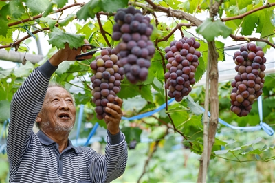 初秋时节,宋村近2000亩葡萄陆续开采,串串圆润饱满、鲜艳剔透的葡萄挂满树藤,在阳光下折射出诱人的玛瑙色彩,令人垂涎欲滴,成为当地村民增收致富的“甜蜜果”。