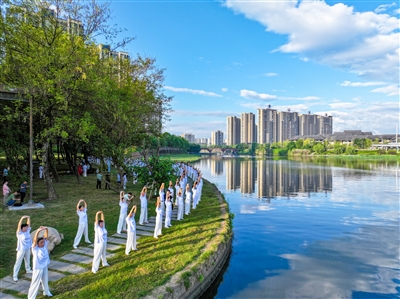 新安江水清岸绿,健身爱好者岸边习练八段锦,动静间尽显和谐之美 樊成柱/摄