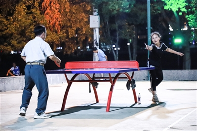 晚间的灯光球场,乒乓球爱好者挥拍对垒 冯溪孜/摄